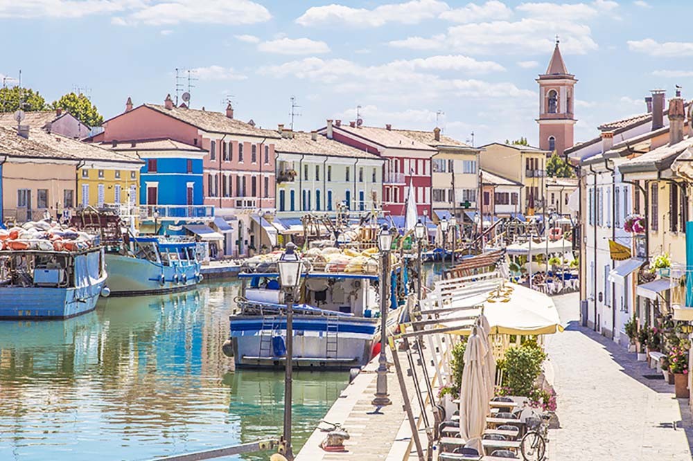 Besuch eines typischen regionalen Marktes und Besichtigung Cesenatico, mit dem romantischen Hafen, welcher 1314 entstand und von da Vinci entworfen wurde. Wahrzeichen der Stadt ist unter anderem das Schiffmuseum. Mittagspause auf der Hafenpromenade mit dem regionalen Fladenbrot "Piadina" und Frischkäse"Squaccherone". Darauf Rimini, einst römische Kolonie das unter der Verwaltung des Augustus mit wichtigen Monumenten ausgestattet wurde.