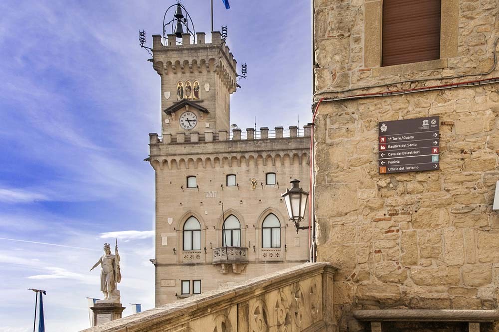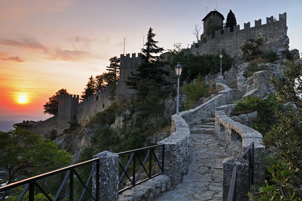 San Marino, älteste und kleinste Republik der Welt. Der Zwergstaat liegt hoch über der Adria auf dem Titano-Berg. Vor dem Abendessen Aperitif bei Sonnenuntergang auf der Panoramaterrasse des Hotels.